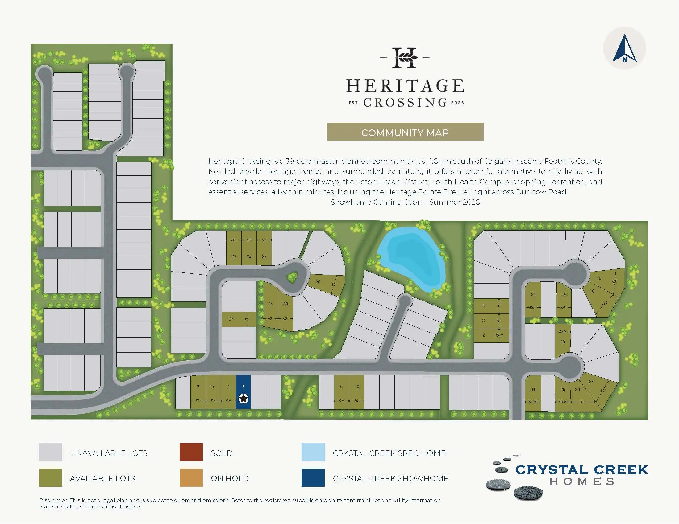 Heritage Crossing is a 39-acre master-planned community located just 1.6 km south of Calgary in scenic Foothills County. Nestled beside Heritage Pointe and surrounded by nature, this exclusive enclave offers a peaceful alternative to city life—without sacrificing convenience.